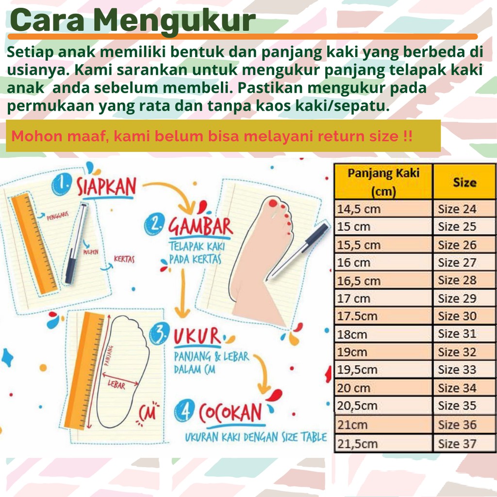 Produk ini memiliki 14 Variasi SIZE yaitu : 24,25,26,27,28,29,30,31,32,33,34,35,36,37,