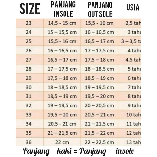 Produk ini memiliki 14 Variasi ukuran yaitu : 24,25,26,27,28,29,30,31,32,33,34,35,36,37,